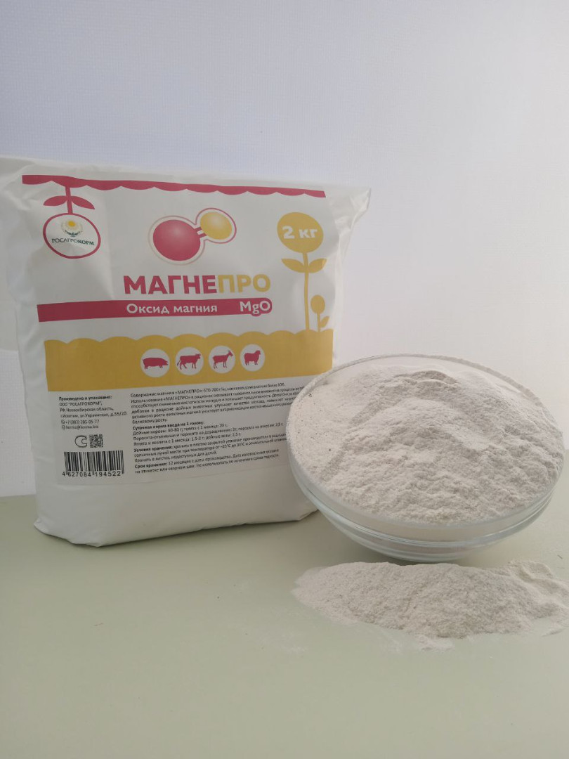 - Восполняет дефицит магния в рационах сельскохозяйственных животных