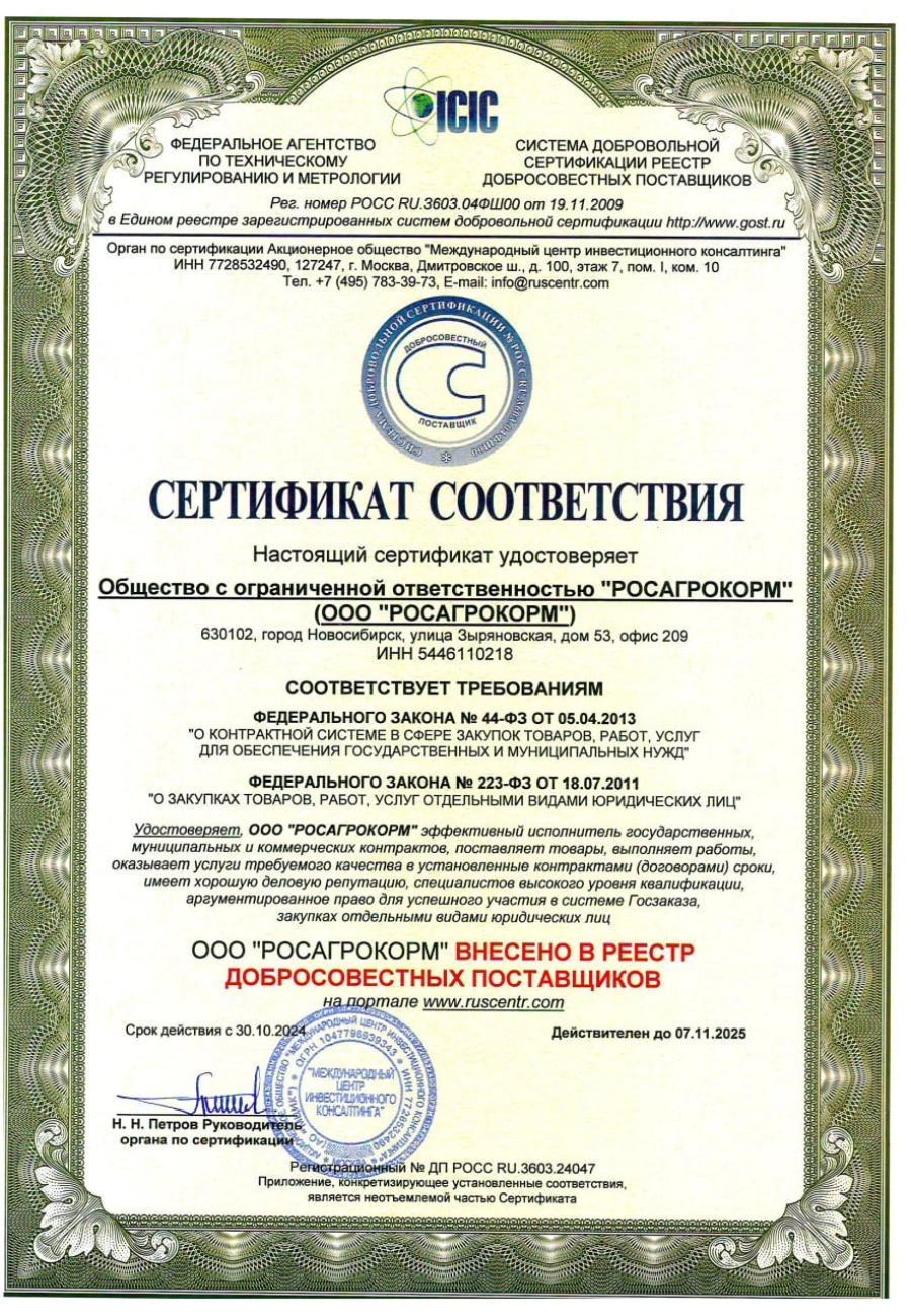 ООО "РОСАГРОКОРМ" ежегодно подтверждает регистрацию в системе добровольной сертификации Реестр добросовестных поставщиков.